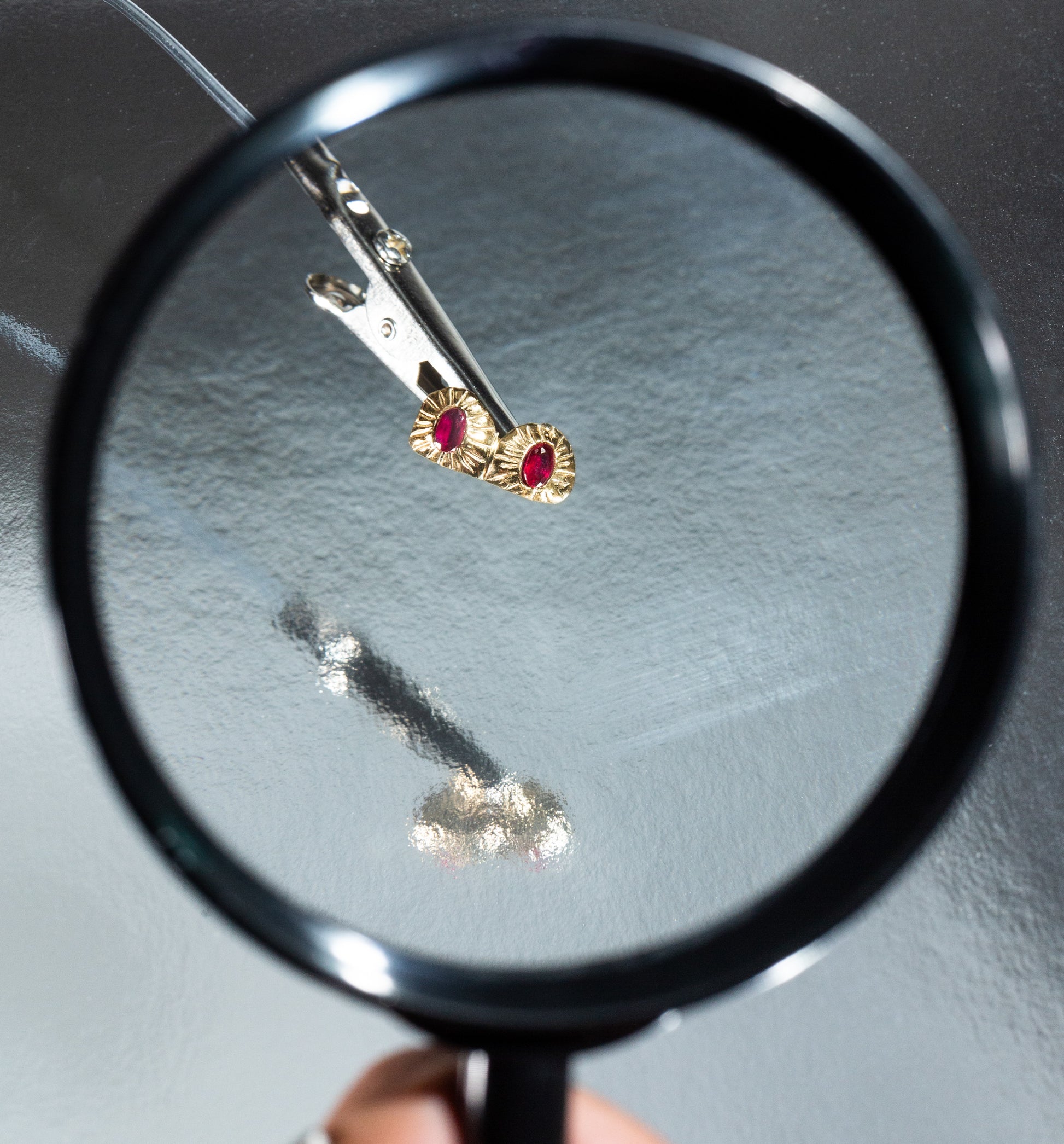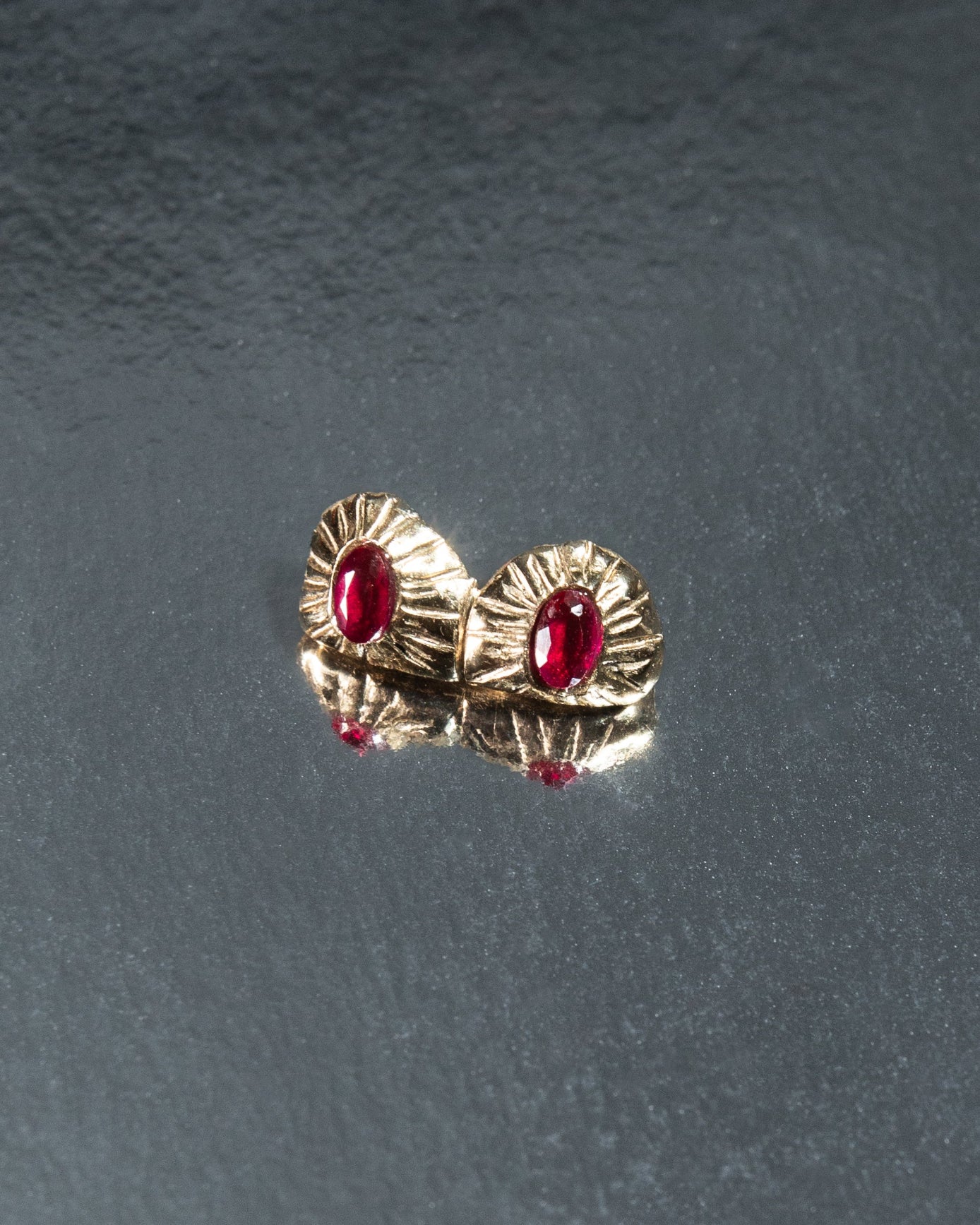 Dos piezas en oro con rubís sintéticos. Brillan como si el pecado fuera un derecho.