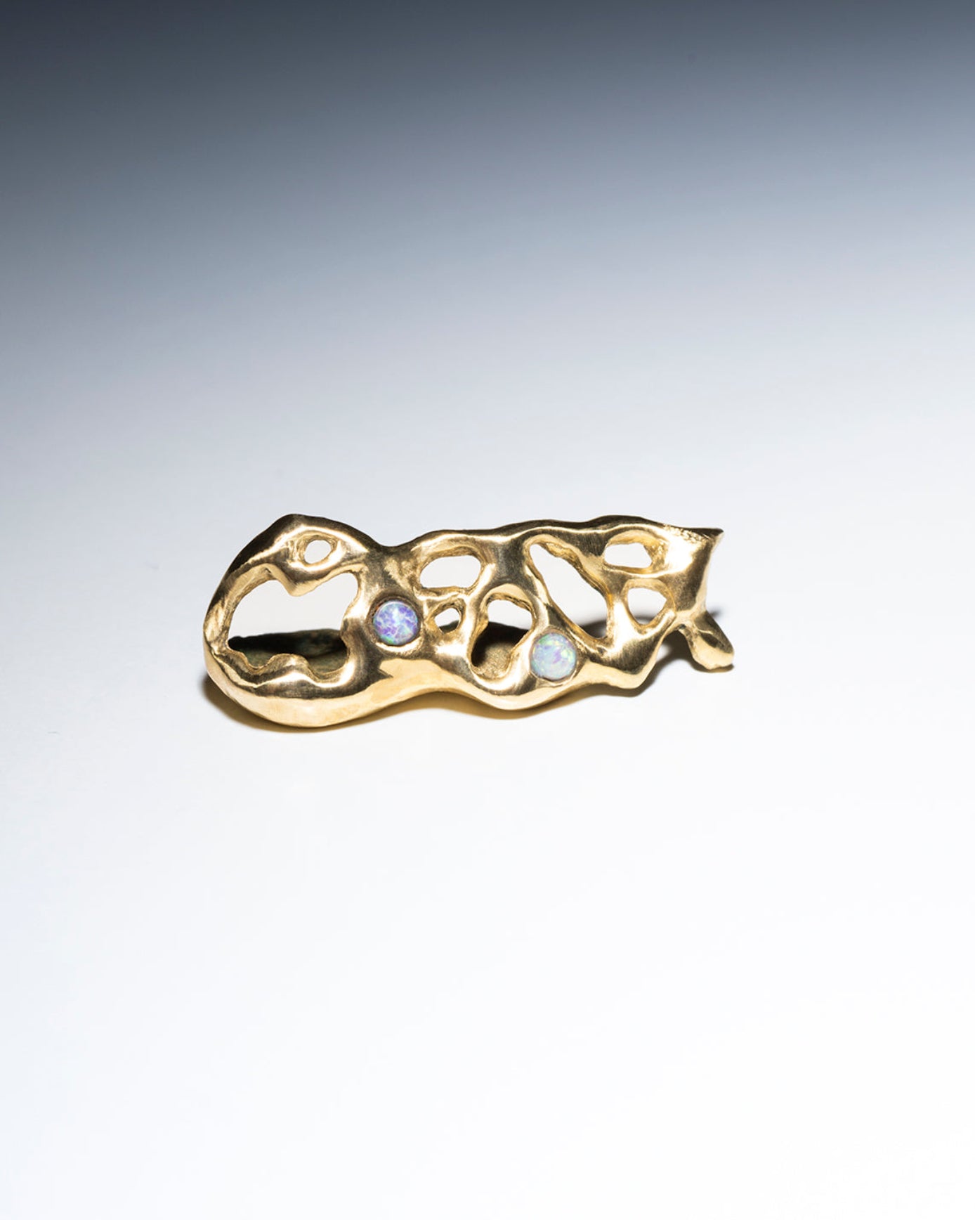 Tres piezas de oro con textura orgánica y ópalos blancos.