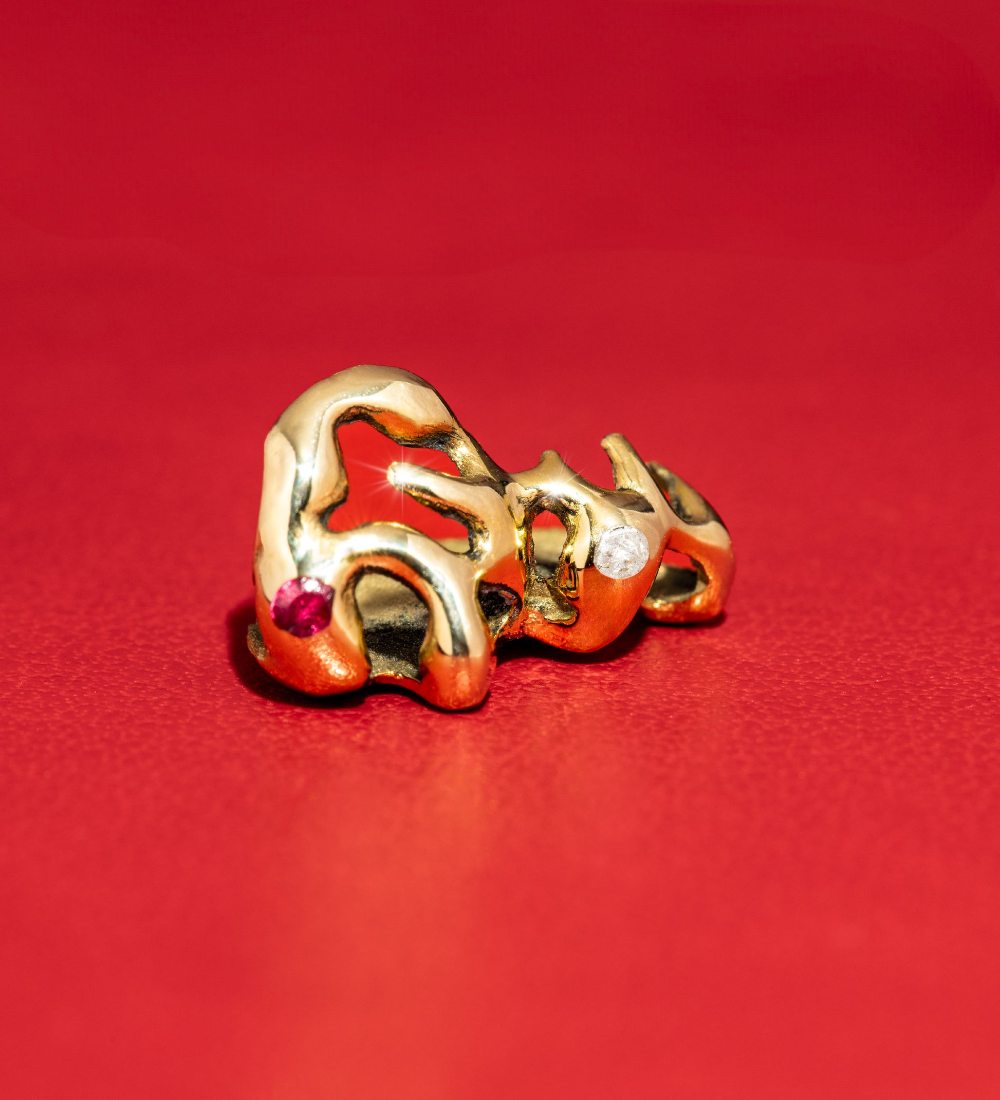 Dos piezas en oro dental con efecto líquido derretido, rubí y moissanita.