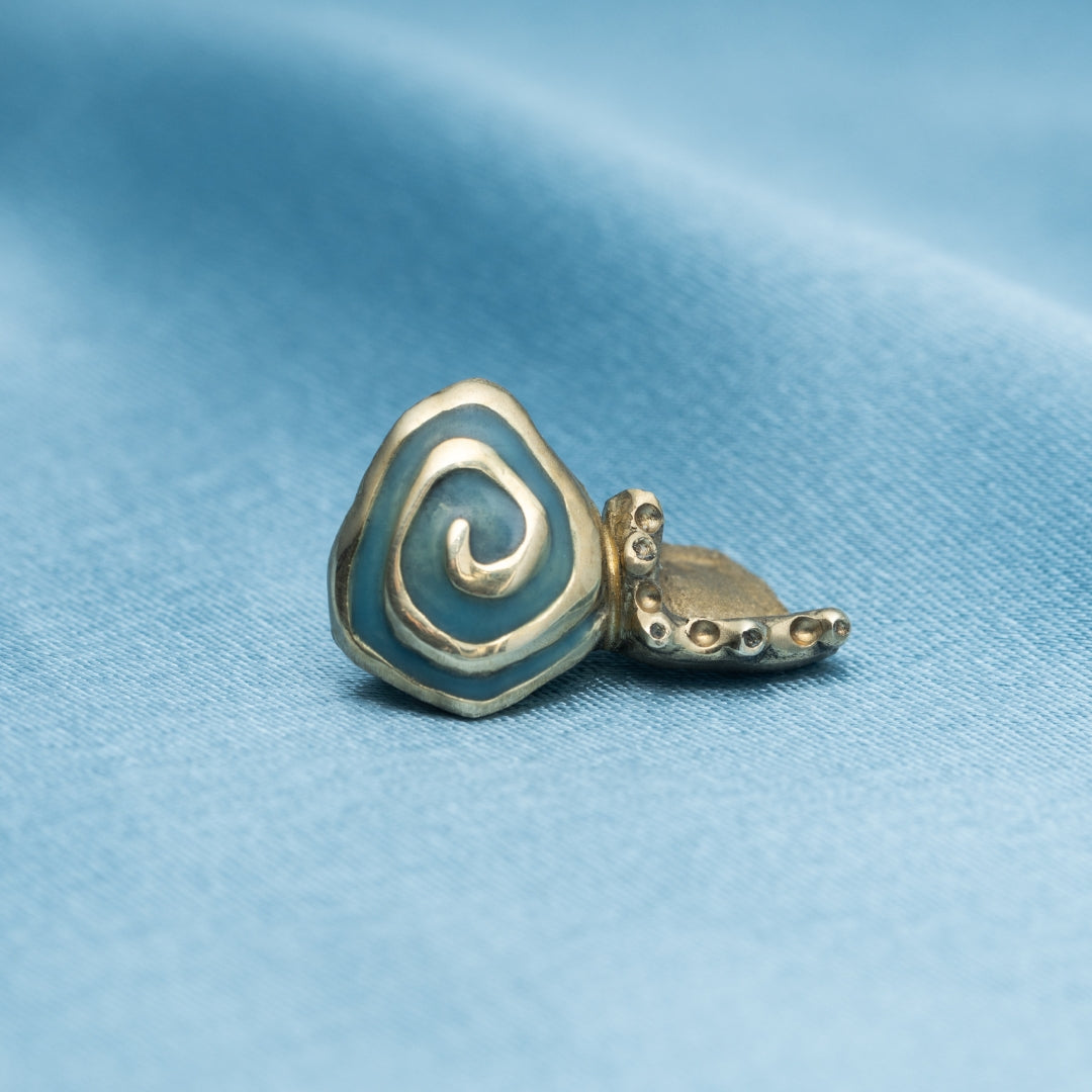 Dos piezas en oro con una espiral esmaltada que hipnotiza y una línea orgánica inspirada en la textura de un pulpo.
